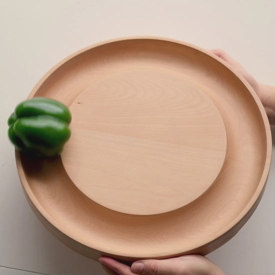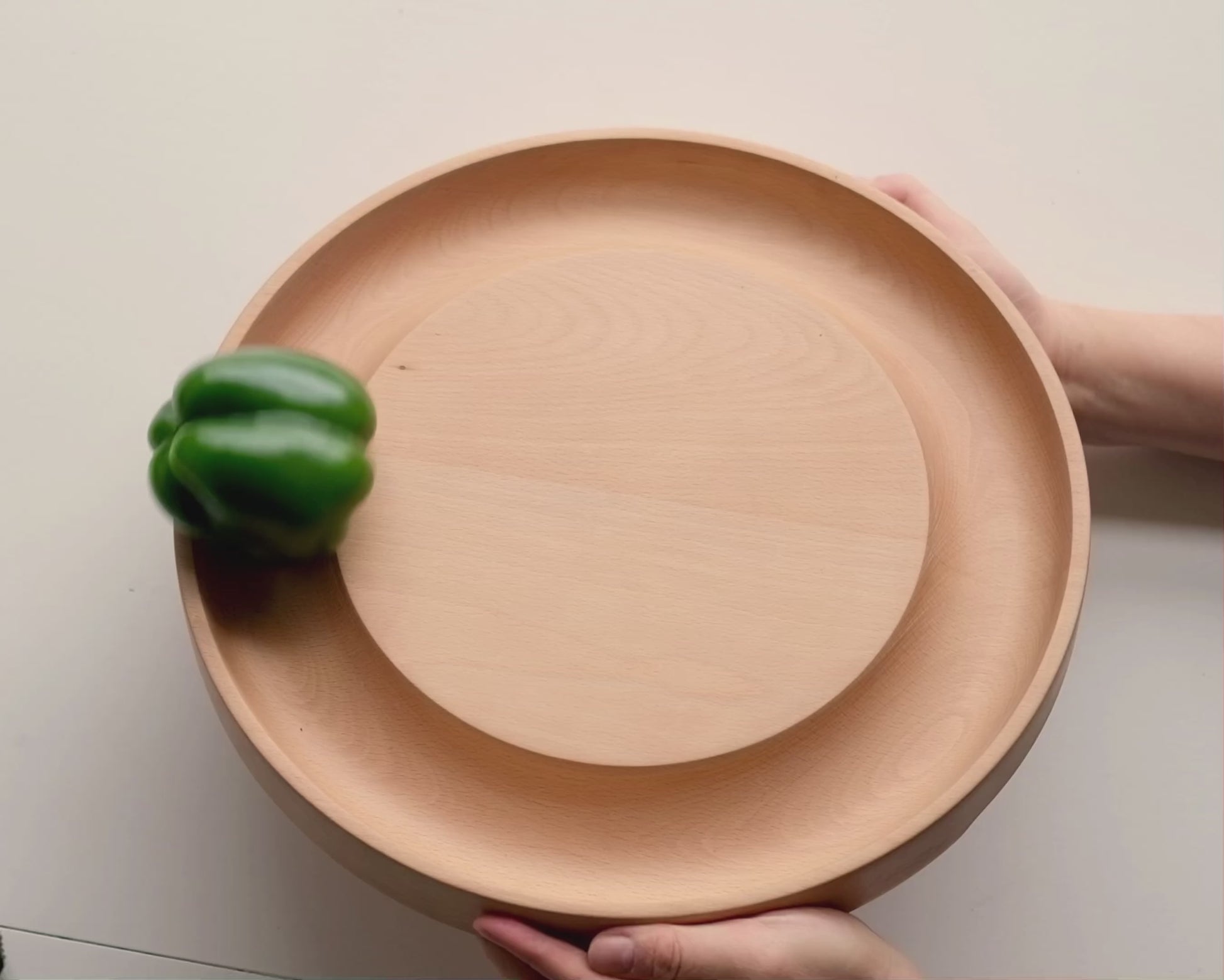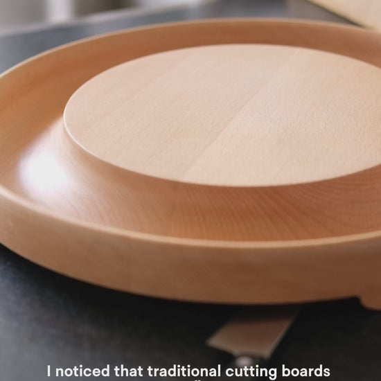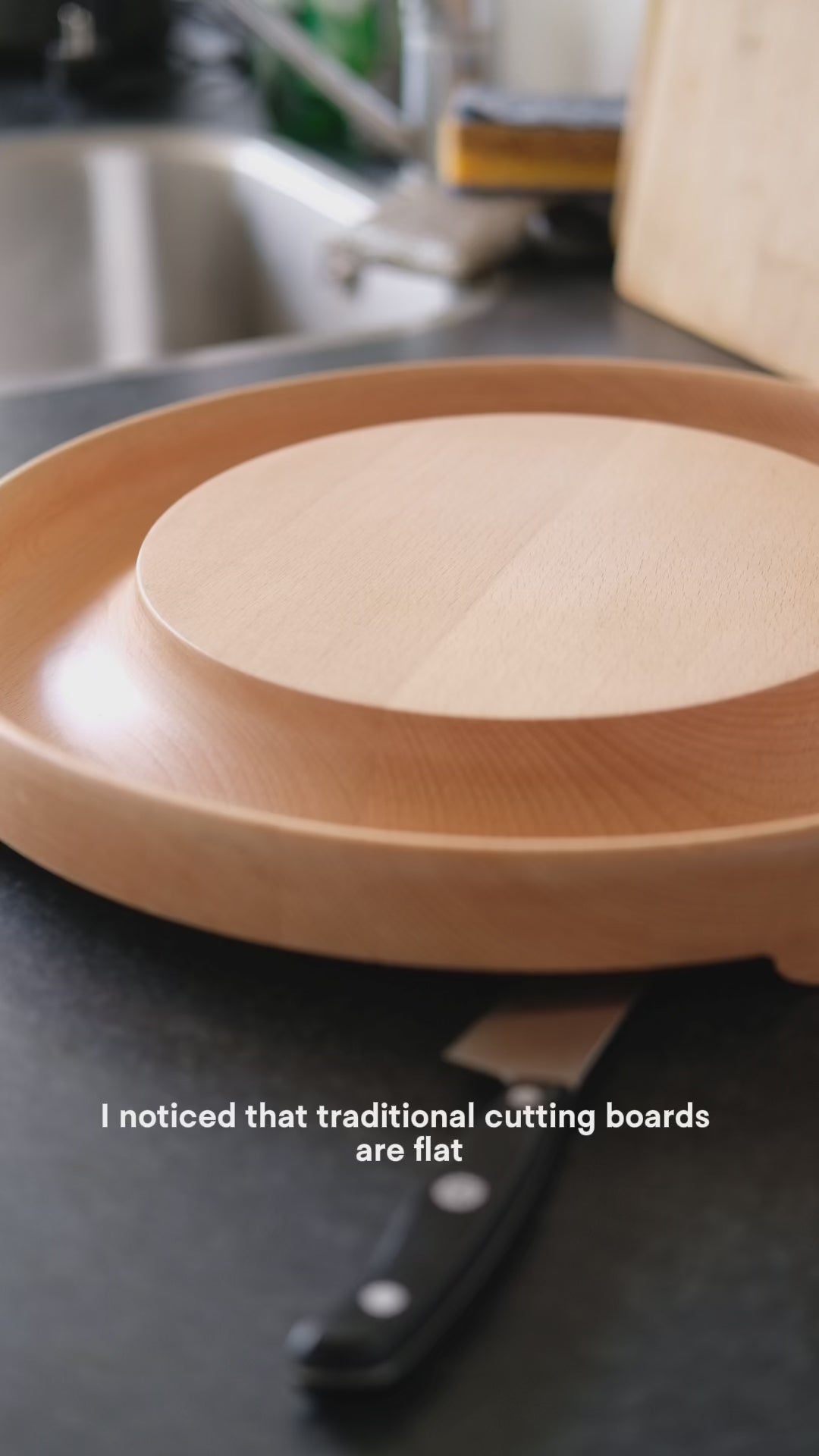 The cutting board is innovatively functions for cutting and serving at the same time. Inspired by the blind cooks, keeping food inside the cutting board is challenging when you can not see. The flat surface in the centre is the cutting area. The cut food will fall into the groove for collecting. And the knife could be stored beneath the board in order to prevent unexpected hurts.